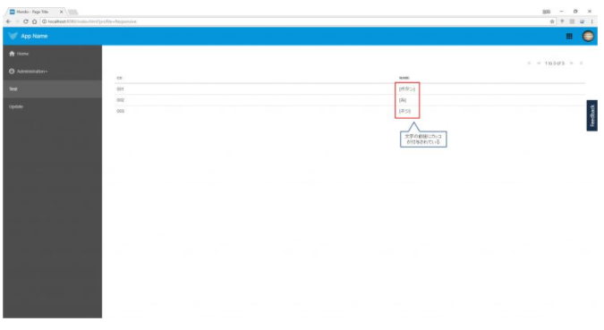 「外部DBの情報の取得方法」の③で作成した画面を開きます。NAMEの前後に”[]”が付与されているのが分かります。