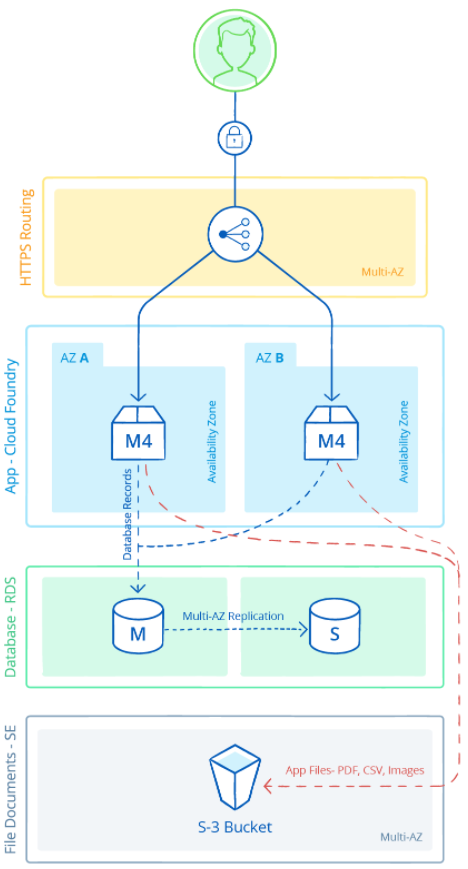 リージョンごとに、Mendix Cloudアーキテクチャは完全な高可用性(HA)として設定され、マルチアベイラビリティゾーンに分割されます。これは、災害復旧のための完全に信頼できる製品があることを意味します。