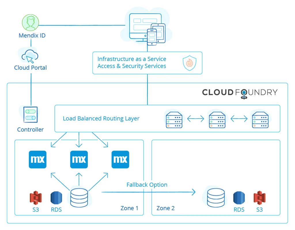 Mendix Cloudは、AWS上で実行されるCloud Foundryを使用したPaaSベースのクラウドアーキテクチャです。 Mendixアプリケーションは完全に分離されたコンテナ内で実行され、データベースやストレージなどのサービスとしてのプラットフォーム(PaaS)サービスを消費します。