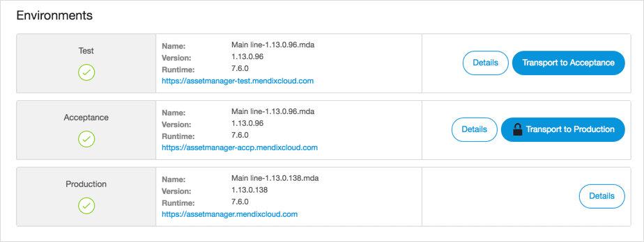 Mendix Cloudでは、段階的なデプロイを可能にするための環境が用意されます。ほとんどのアプリケーションノードには、2つ(受け入れ、本番)または3つ(テスト、受け入れ、本番)の環境があります。Mendixプラットフォームは、 DevOps プロセスに適合する環境の追加をサポートしています。