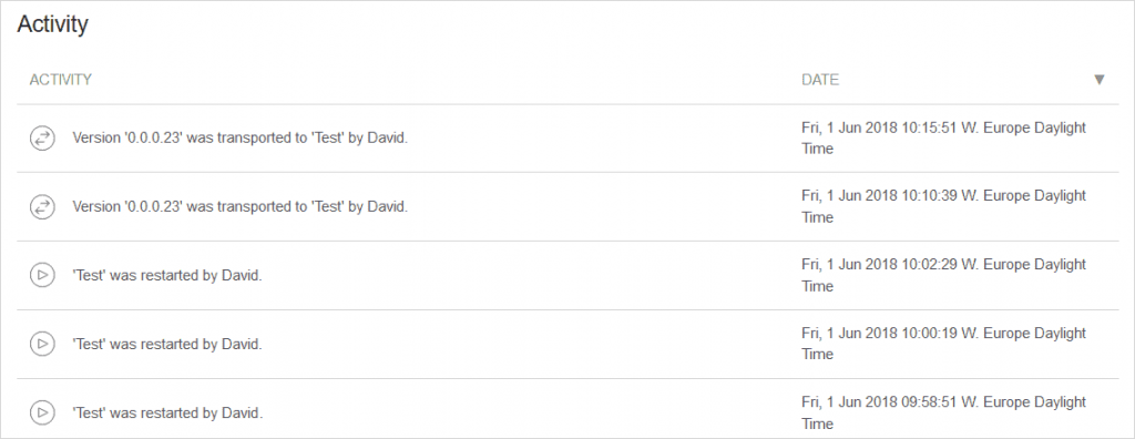 Mendixプラットフォームでのすべてのデプロイ作業がログに記録され、Developer Portal に表示されます。各環境のActivityログを確認して、アプリの環境で実行したユーザーを特定することができます。