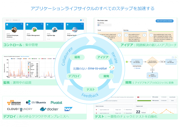 このセクションでは、アイデアから開発、テスト、デプロイ、そしてクラウドまたはオンプレミスでの継続的な運用に至るまで、アプリケーションのライフサイクルのすべてのステップを加速できるMendixプラットフォームのコンポーネントについて説明します。
