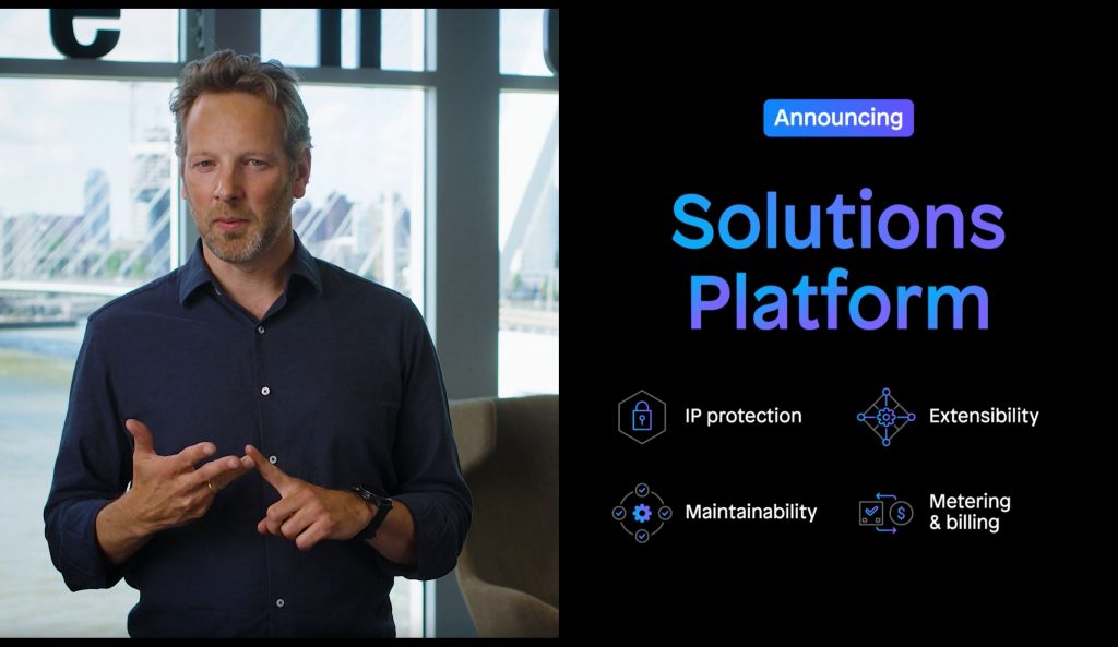 これらのケーススタディをもとに、Derekは固定型のSaaSソリューションは過去のものであり、アダプティブ・ソリューションが未来のものであるという次の主旨を述べています。そしてDerekは、「これらのソリューションには顧客独自の要件に合わせて簡単にカスタマイズ、拡張、パーソナライズできる再利用可能なコンポーネントが使われている。」と言います。この再利用可能なコンポーネントがもたらす課題を、Derekはソリューションプラットフォームの発表によって解決できると考えています。ソリューションプラットフォームには、IP(知的財産)保護、拡張性、保守性、計測・課金の4つの重要な機能が含まれており、お客様がカスタマイズして深みのあるソリューションを的確に商品化することができます。