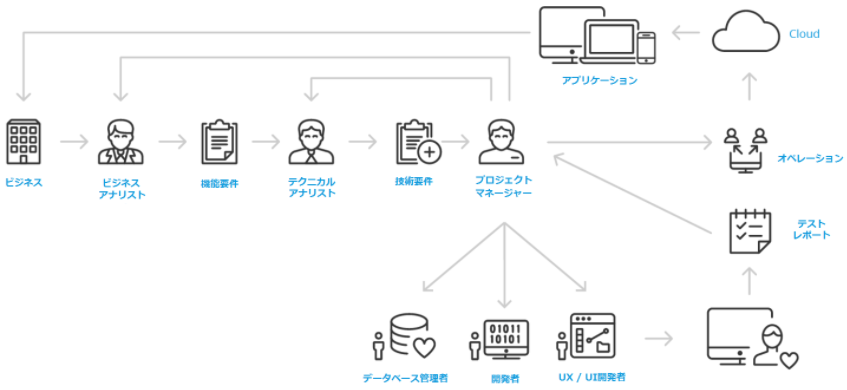 通常、ビジネスアナリストは機能要件を作成し、その要件を技術仕様に変換するテクニカルアナリスト、データベースを作成しデータベーススキーマを設計するデータベース管理者、ワイヤフレームとデザインを作成するUX / UI開発者、そして多くの開発者がアプリケーションをコーディングして、すべての要素をまとめてアプリケーションが作成されます。