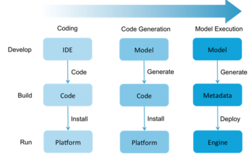 アプリケーションを実行するためにアプリケーションモデルからコード(Javaや.NETなど)を生成するアプローチとは対照的です。