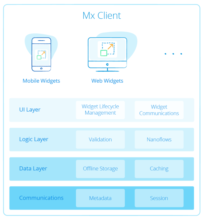 - 通信レイヤー–セキュアなJSON over HTTPプロトコルを使用しながら、Mendixランタイムサーバーとメタデータ、セッション管理、データを交換します。