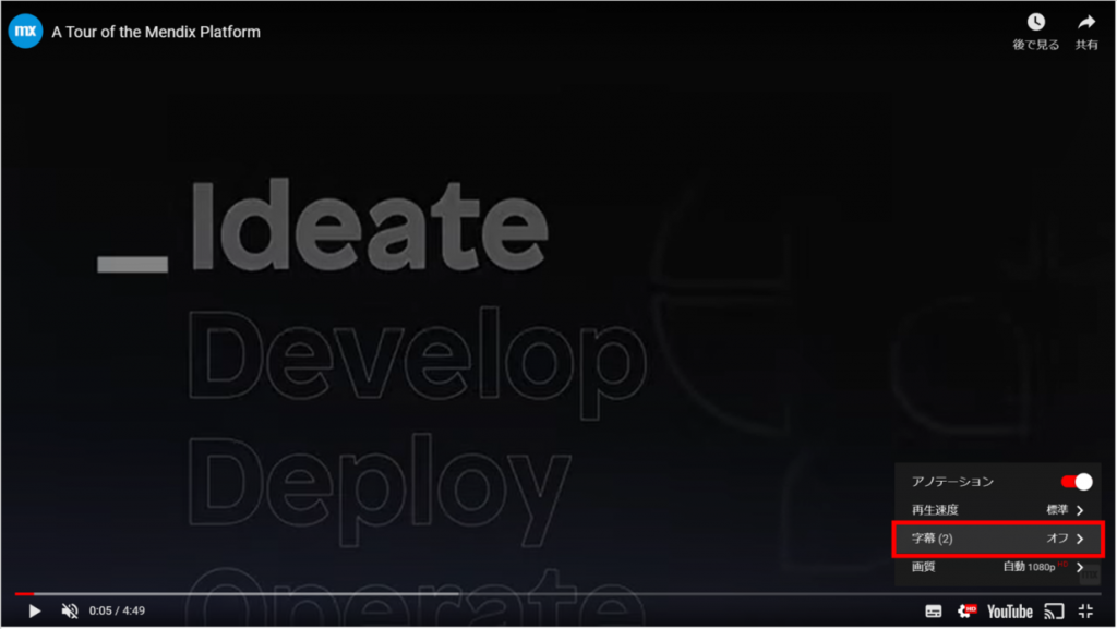 4.その後 「自動翻訳」から日本語を選択することで日本語の字幕が表示される